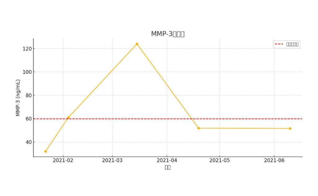 💡 補足: MMP-3(マトリックスメタロプロテイナーゼ-3)は、滑膜から分泌される酵素の一種で、関節破壊の進行度を示す目安とされています。